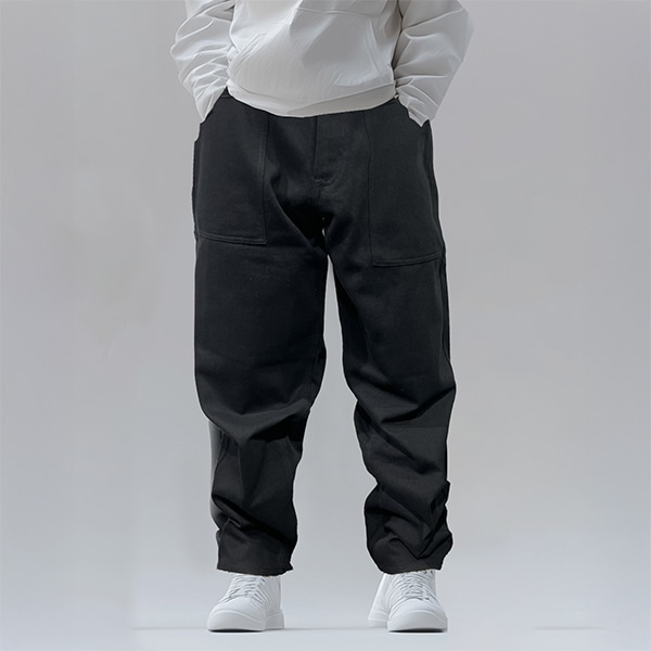 ワークパンツの代表ベイカーパンツを男らしい武骨さは残しつつ着心地はゆったりだけど色を黒で作ることですっきりした印象の大人な1本!