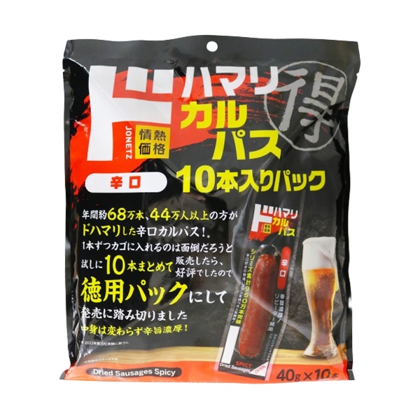 年間約68万本、44万人以上の方がドハマリした辛口カルパス!1本ずつカゴに入れるのは面倒だろうと試しに10本まとめて販売したら好評でしたので、徳用パックにして発売に踏み切りました!中身は変わらず辛旨濃厚!