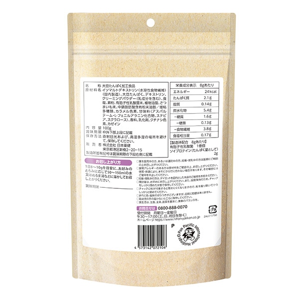 イソマルトデキストリン(水溶性食物繊維)(国内製造)、大豆たんぱく、デキストリン、クリーミングパウダー(乳成分を含む)、食塩、澱粉、有胞子性乳酸菌末、植物油脂、さつまいも末、中鎖脂肪酸含有粉末油脂/増粘多糖類、カラメル色素、甘味料(アスパルテーム・L-フェニルアラニン化合物、ステビア 、スクラロース )、香料 、乳化剤 、クチナシ 色素 、カゼイン