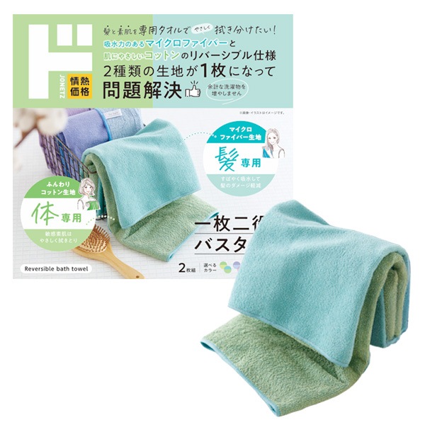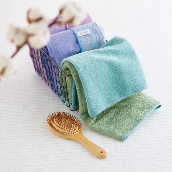 吸水力のあるマイクロファイバーは髪専用としてすばやく吸水、肌にやさしいコットン生地は敏感素肌をやさしく拭き取り体専用に!