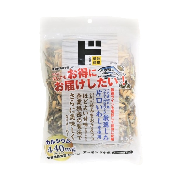 ■原材料:アーモンド(アメリカ産)、煮干魚類(カタクチイワシ(国内産)、食塩)、砂糖、ごま、水飴、食塩、(一部にアーモンド・ごまを含む)