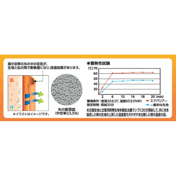 かさばらないのにあったか!ちくわ構造繊維が糸の中に暖かい空気を蓄え、さらに吸湿発熱加工で暖かさアップ!