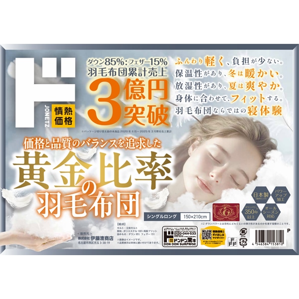価格と品質のバランスを追求した黄金比率、ダウン85% :フェザー15%のオールシーズン対応羽毛布団!