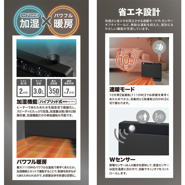 うるうるぬくぬく、ハイブリッド式加湿×パワフル暖房のしっとりうるおう超音波+ヒーター加湿と大風量で広いお部屋も秒速ポカポカ!